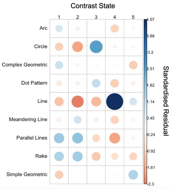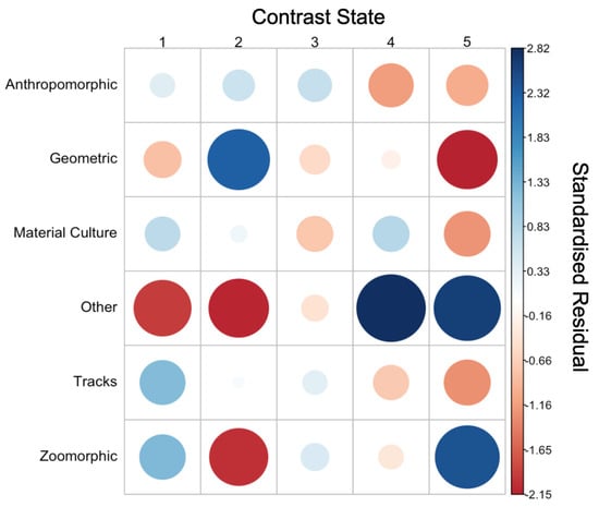Some stylistic variability in SB figures could be due to changes through time in production. Contrast state information (Figure 12) revealed that while three SBs were produced in CS1, most SBs were CS2 and CS3, with significant declines in CS4 and CS5. The MCA revealed that the earliest motifs (CS1) were stylistically homogenous (i.e., located closest to the origin on the bivariate plot), while early in the main period of solid-body production (CS2), there was great diversity, which retracted in CS3 and then further again in CS4 to again demonstrate more stylistically homogenous motifs. Further patterning through time could be observed, as follows: