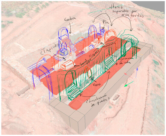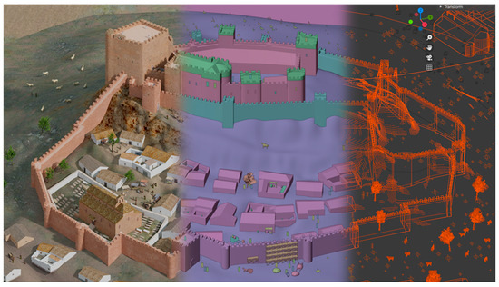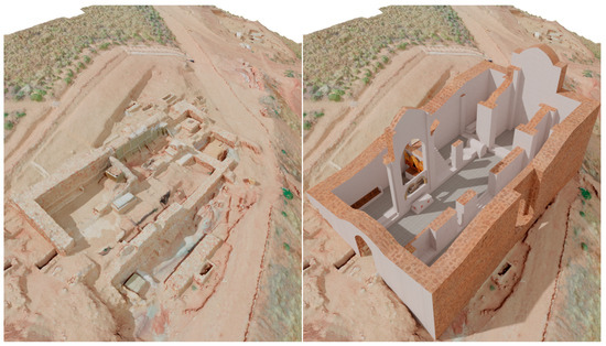 The first application, the most logical, is the virtual reconstruction of lost elements, whether they be buildings or movable items, based on preserved material remains (if any), documentary descriptions, planimetries, pictorial, or photographic representations. The degree of their scope and detail depends on the factors discussed before: objectives, level of knowledge, resources, etc. One example of this is the reconstruction of the main apse of the Romanesque Cathedral of Girona (Spain), which includes both architectural elements and artifacts (Ledesma et al. 2024). Another example is that of some missing buildings in the city of Granada (Spain) (Rodríguez Moreno 2016). In our case, this is illustrated with the restoration of the spaces of the Church of Nuestra Señora de la Estrella of Montiel (Ciudad Real, Spain), where the digitalization of the site led to the raising of some of its walls, yielding a better grasp of its spatial arrangement (Figure 3).