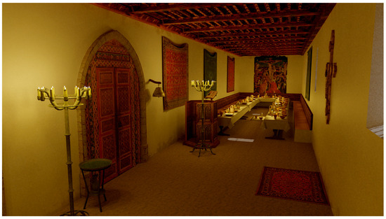 Another application closely linked to those above is the placing of objects in their original context, as most are today preserved elsewhere. And although in many cases this is due to conservation and protection, the consequence is that they cannot be fully interpreted as they were originally conceived. Here again, Virtual Archaeology offers the possibility of transferring these decontextualized objects to their original positions. This can likewise be applied in an opposite manner, allowing for the recovery of the original image of transformed or empty spaces by relocating their furniture and decor. A specific example is the reintegrating of the stalls of the Cathedral of Oviedo (Spain) in the study by Sánchez Riera et al. (2022). We also applied this aspect to the reconstruction of the medieval refectory of the Convent of Uclés (Cuenca), where, in the absence of preserved elements, we relied on documentary descriptions and based our modelling of the furniture on objects from the same period (Figure 5).