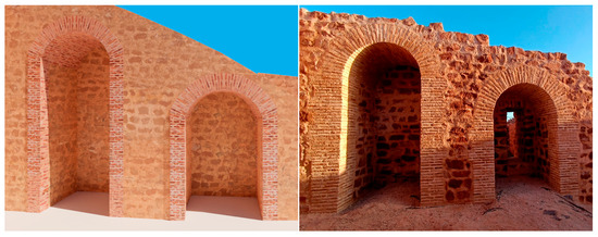 Comparison between the virtual restoration of two arches of the archaeological site of the Castillo de la Estrella of Montiel (Ciudad Real, Spain) (left), and the final result after completion (right) (image by the author).