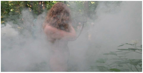 The black screen signaling the beginning of Let Me Say: It’s Not Forgotten dissipates and a subtle soundtrack carries the viewer into the forest where the narrative begins to unfold. A continuous cacophony of chirping birds, splashing water, twigs breaking underfoot, and the subtle chorus of women’s voices accompany the video-performance. A persistent indiscernible haze undulates within the dynamics of the narrative, enveloping the trees, Kulikovska’s body, and the sculptures (Figure 3). These two elements create an air of uncertainty within the video and simultaneously establish a cyclical quality to the narrative. The sound and floating atmospheric effects are continuous throughout the video-performance, ebbing and flowing, as the narrative reaches a climax. When Kulikovska becomes poised to shoot, the disembodied women’s chorus crescendos as the haze intensifies. Once Kulikovska pulls the trigger, the screen becomes enveloped in the haze, disorienting the viewer, and encouraging them to wonder whether this is smoke from the gun. The sound of women’s voices once again audibly emerges in the soundtrack as the haze or smoke begins to clear and reveals Kulikovska standing amongst her sculptures. The voices fade in and out as the video-performance concludes with the haze floating in a clearing between two trees.