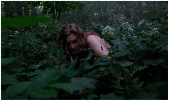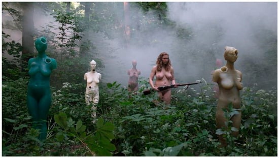 The shooting of Kulikovska’s sculptures that comprised Army of Clones and Homo Bulla by DPR militants was ideologically charged in order to assert their power over women’s bodies and deny those who do not conform the ability to exist within the DPR. Kulikovska described them as an execution, the symbolic killing of bodies and individuals that posed a challenge to order in the DPR, and a foreshadowing of suffering to come under their leadership. By destroying her sculptures, the militants symbolically established who could belong to society in the DPR; artists such as Kulikovska who challenged the regime were banned (Ilchuk 2017, pp. 256–73). Let Me Say: It’s Not Forgotten resists this mandate as Kulikovska refuses to conform to the position of victim and, instead, survives by harnessing the technology of oppression to critique it. This refusal to accept the power and authority of the DPR within her video-performance empowers herself as she stares at the viewer, meeting their gaze, in confrontation and challenge. She challenges them to resist the authority of militarization and, instead, rebel, thereby creating the following situation: