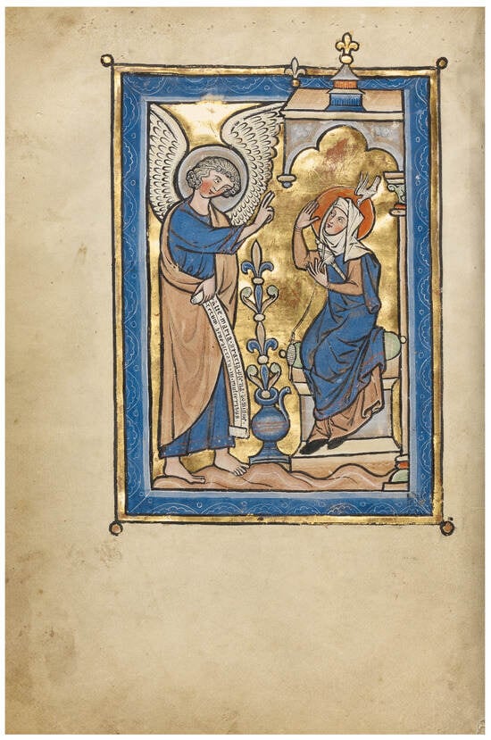 The Virgin Mary interrupted by Gabriel at her wool work appears in art as early as the late 4th century but falls significantly out of fashion by the Carolingian period, when Mary’s handwork is trumped by her spiritual, rather academic work of reading (Cartlidge and Elliot 2001, pp. 79–80). From the 9th century onwards, artists usually picture Mary at the Annunciation reading from an open book rather than spinning (Cartlidge and Elliot 2001, pp. 79–82). That Mary’s reading replaces her spinning reflects growing literacy patterns for women in medieval Europe. In her seminal essay “Medieval Women Book Owners: Arbiters of Lay Piety and Ambassadors of Culture”, Susan Groag Bell proved the importance of women readers as teachers and transmitters of knowledge and cultural traditions to their children (Bell 1982, pp. 742–68). The Virgin as reader was part of this tradition.