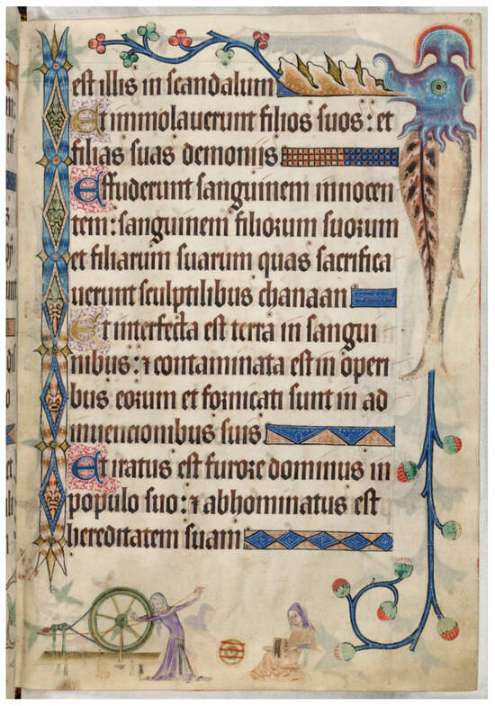 Similarly, the Virgin Mary spins despite interruption at the Annunciation. The act of spinning is one of the many connection points between Eve and Mary: the first woman spins in support of her family, while Mary (as the New Eve) spins in anticipation of her pregnancy and growing family. In a psalter from Flanders made in the mid 1200s, the Virgin spins using a drop spindle and distaff (under her arm) as she gestures towards the Angel Gabriel (Figure 2).9 Her spinning at the Annunciation is rooted in an apocryphal text, the Protoevangelium of St. James. According to the text, the priests of the temple called the “undefiled virgins of the House of David” to spin the wool for the temple veil.10 After receiving a preliminary and shocking visit from the angel Gabriel while getting water at the well, Mary returned home to spin her sacred wool: “and she went away, trembling, to her house, and put down the pitcher; and taking the purple, she sat down on her seat, and drew it out. And, behold, an angel of the Lord stood before her”11 (https://www.newadvent.org/fathers/0847.htm, accessed on 18 June 2025). After Gabriel disappeared, Mary “made the purple and the scarlet, and took them to the priest”12 (https://www.newadvent.org/fathers/0847.htm, accessed on 18 June 2025).