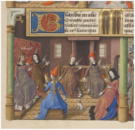 The scene corresponds with Boccaccio’s text, which outlines how Iole was so horrified that Hercules killed her father that she sought to humiliate him as punishment. He writes, “Iole, however, was moved more by love for her slain father than for her husband and was eager for vengeance” (Boccaccio 2001, p. 91). Iole’s punishment begins with dressing him in women’s clothing, jewels, and cosmetics. Finally, she forces Hercules to sit with her servant girls and tell stories of his labors. Boccaccio explains, “Taking the distaff, he would spin wool, and though now an adult—indeed a man of advanced years—he softened to stretch threads the very fingers he had hardened to kill serpents while still a baby” (Boccaccio 2001, p. 93). This manuscript clearly illustrated all of the elements from the text: the aged hero surrounded by women as he is literally forced to spin a yarn. As in the “world upside down” imagery, gender roles are here subverted, and women’s work is thus demeaned.