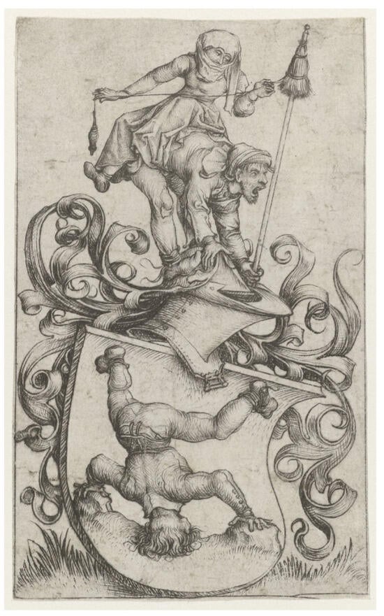 | 32 | Housebook Master, Coat of Arms with the World Upside Down, ca 1480–1490). Rijksmuseum Amsterdam. Contemporary prints of witches employ similar iconography of a woman riding on a goat while spinning. |