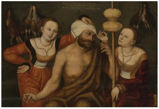 The Power of Women topos has elements of exaggerated absurdity as well. Following in this vein, Omphale as threat and Hercules as victim, verges on the realm of the ridiculous or comedy as we move through the premodern period. An example that shows the widespread popularity of the theme is found in the work of Lucas Cranach.34 In Cranach’s 1531 painting of Hercules and Omphale, now in a private collection, the hero is in the center of the composition flanked by two women (Figure 14). He wears a brown drapery, evocative of his lionskin, that covers one shoulder, exposing his chest and arm marked by a well-defined bicep. His beard and muscles are a direct contrast to the woman’s cap on his head, highlighting his submission and underscoring his emasculation. One of the women rests her hand on the cap, giving the impression that she has just placed the garment on the hero’s head. The other woman guides fiber from the distaff to Hercules’ hand; she holds the base of the distaff. Her delicate hand offers a foil to Hercules’ as she attempts to teach the skill of spinning. Hercules spins, but he is under the control of the women. The inscription alludes to this domination, the text of the inscription in the image identifying him as “a little child” and a “dominated child.”35 Lisa Rosenthal explains further, “Moreover, the threat to masculinity remains consistent: it is the pull towards regression, towards the dreaded, desired, infantilizing female realm.” (Rosenthal 2005, p. 166) Everything about this painting alludes to discomfort, domination, and control. Hercules is to be pitied but also ridiculed.