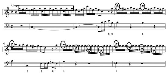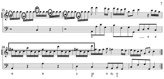 Figure 4. Georg Philipp Telemann, Sonata in C Major for Recorder and Basso Continuo, TWV 41:C2, Allegro, mm. 25–30. (Collection Musicale en Format Numérique n.d.).