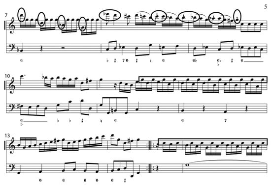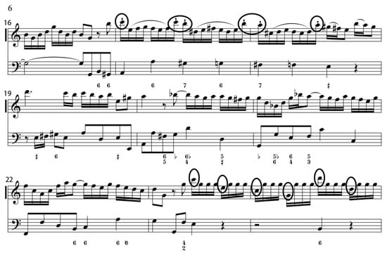 Figure 3. Georg Philipp Telemann, Sonata in C Major for Recorder and Basso Continuo, TWV 41:C2, Allegro, mm. 16–24. (Collection Musicale en Format Numérique n.d.).