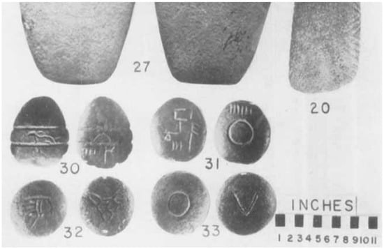 Figure 10, one of these marked stones featured an incised “V”. Klamath tribal member Elizabeth “Lizzy” Kirk, who eventually sold the collection to Carlson, told him that the four inscribed stones were medicinal heating stones she had obtained from a man named Reinhold, who himself received them from a shaman and was meant to help him with his rheumatism (