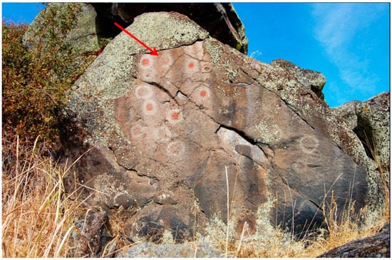 Figure 11, features thirteen white and red and white circles and constitutes our main focus in this paper. The red arrow near the top of the photo points to a curious, faded figure that resembles a fish. Some tribal members regard it as a depiction of a salmon. Based on this identification, a few have concluded that the whole site constitutes an ancient “fishing calendar,” which unfortunately can no longer be read.