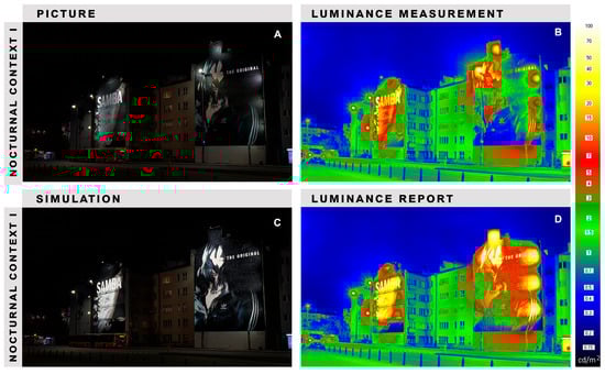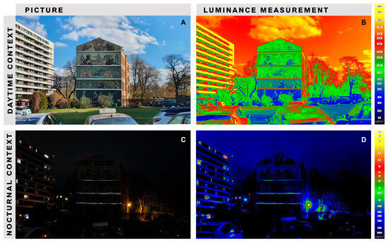 Artistic mural in the urban context: luminance distribution analysis. (A) Daytime photograph of the artistic mural. (B) Luminance distribution of the selected artistic mural under daylight conditions (measured using the TechnoTeamMatrix Luminance Meter). (C) Night-time photograph of the artistic mural. (D) Luminance distribution of the selected artistic mural under night-time conditions (measured using the TechnoTeam Matrix Luminance Meter).