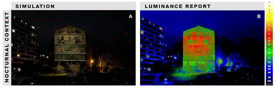 Artificial lighting simulation of the artistic mural, compliant with relevant recommendations and standards. (A) Collage of the night-time photograph and the digital simulation of the illuminated artistic mural, with matching exposure levels. (B) Collage of the actual background luminance distribution and the luminance distribution of the illuminated artistic mural, generated using FloodLum2 software.