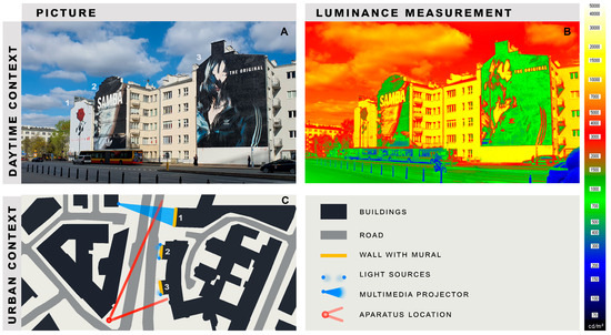 Only a careful observer, while walking along the street, may notice that an additional factor differentiating the murals is the texture of the walls and the type of painted surfaces, which range from matte to glossy finishes. These surfaces exhibit different reflective properties resulting from the use of varied materials and painting techniques, making these murals a particularly interesting subject for observation. An analysis of the luminance distribution under daylight conditions (Figure 3B) reveals that the inverted daylight contrast approach, identified as suitable in Section 3.1, does not apply effectively in this case. Although the average luminance of the sky remains the same as in the case of the artistic mural, the first commercial mural shows an average luminance of approximately 10,000 cd/m2, the central one around 4500 cd/m2, and the third about 2000 cd/m2.