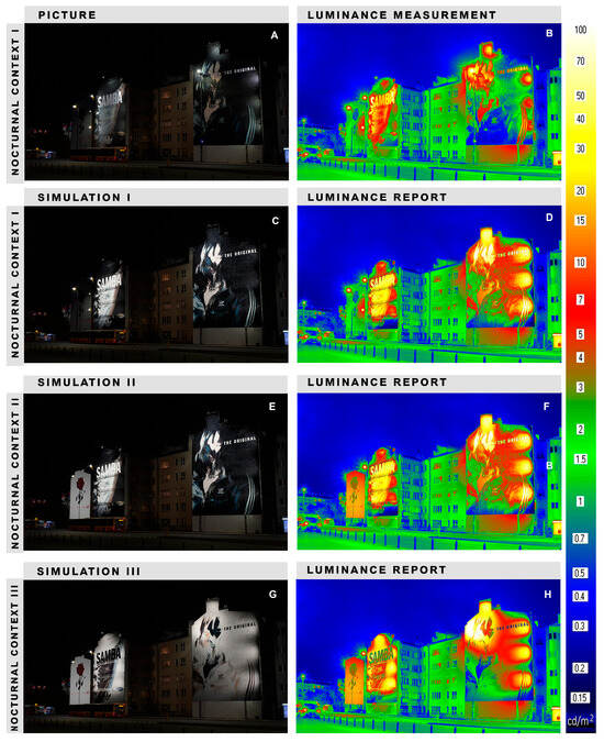 New ways of illumination with different luminance distributions: comparison with the existing lighting layout. (A) Night-time photograph of the three commercial murals. (B) Actual luminance distribution of the three commercial murals under night-time conditions (measured using the TechnoTeam Matrix Luminance Meter). (C) Artificial lighting simulation I: collage of the night-time photograph and the digital simulation of the illuminated commercial murals, with consistent exposure levels. (D) Collage of the actual background luminance distribution and the luminance distribution of the illuminated commercial murals (C), presented using the false-color technique. (E) Artificial lighting simulation II: collage of the night-time photograph and the digital simulation of the illuminated commercial murals, with equal luminance levels across all murals. (F) Collage of the actual background luminance distribution and the luminance distribution of the illuminated commercial murals (E), presented using the false-color technique. (G) Artificial lighting simulation III: collage of the night-time photograph and the digital simulation of the illuminated commercial murals, with inverted contrast between the second and third mural. (H) Collage of the actual background luminance distribution and the luminance distribution of the illuminated commercial murals (G), presented using the false-color technique.