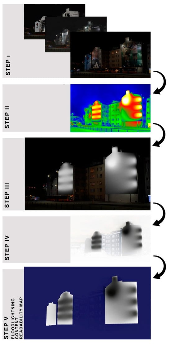 Floodlighting Content Readability Map: luminance distribution on a plain wall as a guideline for mural creation and composition. Step I: Night-time photograph of the actual mural scenario. Step II: Luminance distribution presented using the false-color technique. Step III: Simulation of existing lighting on a plain white wall. Step IV: Contrast inversion. Step V: Creation of the Floodlighting Content Readability Map, with black marks indicating the most illuminated wall areas–local overexposures.