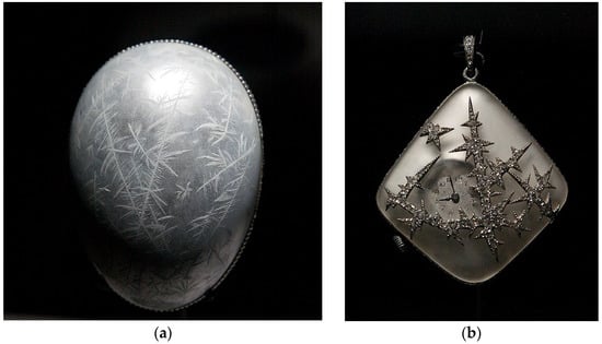 - Sotheby’s Inc. 2019. A Very Rare Fabergé Jewelled Rock Crystal ‘Snowflake’ Pendant. Workmaster Albert Holmström. After the Design by Alma Pihl. St Petersburg, circa 1913. Auction Catalogue. November 26, 2019. Available online: https://www.sothebys.com/en/buy/auction/2019/russian-works-of-art-faberge-and-icons/a-very-rare-faberge-jewelled-rock-crystal (accessed on 26 July 2023).