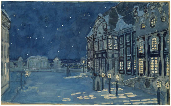 - State Tretyakov Gallery, Moscow. 2025. Aleksandr Golovin, Square in Front of the Palace Near the Neva, 1900, Sketch for the Set of “The Ice House” by Arsenii Koreshchenko (Act II, scene 2). Catalogue Notes. Available online: https://my.tretyakov.ru/app/masterpiece/21307 (accessed on 10 July 2023).
