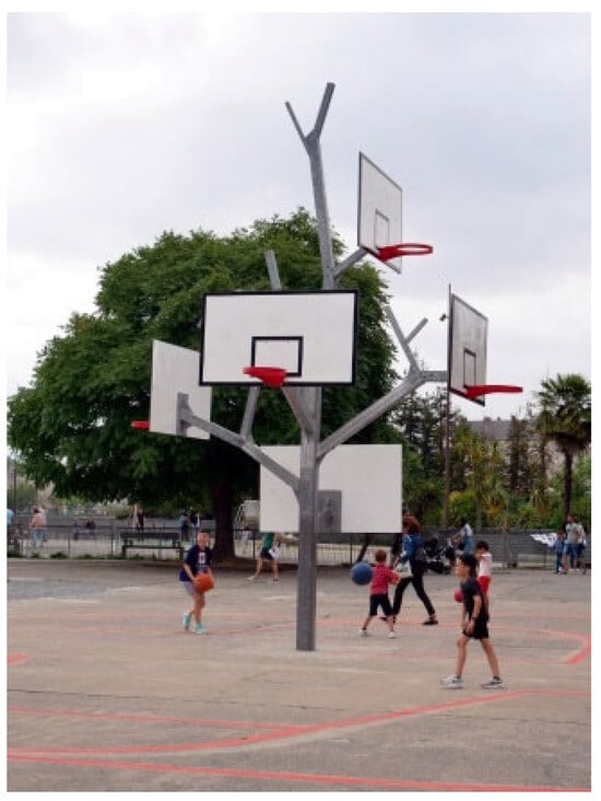 Many works are the setting for the users’ daily activities, making them obvious and somewhat ‘transparent.’ These include, for example, sports facilities. L’Arbre à Basket from 2012, designed by the a/LTA agency, was set up in the Parc des Chantiers near the children’s playground. It is a metal structure shaped like a simplified tree, to which basketball hoops are attached at different heights (Figure 6). The visually appealing form allows people of different heights to participate, for several teams to play simultaneously, or for creative innovation of the rules. Several playing fields designated on the pitch were added to the tree (Le Voyage à Nantes 2025).