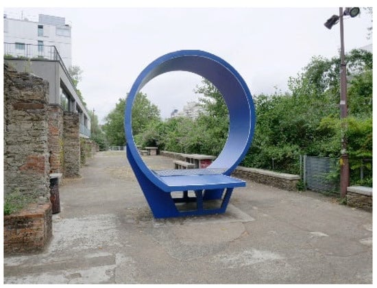 The installation Ping-Pong Park by Laurent Perbos from 2017, placed, or perhaps rather, unfortunately, hidden, in an intimate garden at the Quai François Mitterrand is a gaming table enhanced by a blue spiral hoop (Figure 7) (Le Voyage à Nantes 2025). The utilitarian sculpture diversifies the game with unexpected bounces of the ball in surprising directions, defying the established logic of the game.