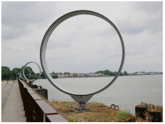 Among the works of art that are particularly in tune with the topography and architecture of the city, it is worth mentioning Les Anneaux, which Daniel Buren and Patrick Bouchain designed for the 2007 Estuaire Festival. The installation consists of a sequence of 18 silver rings, attached to old bollards on the quay of the Île de Nantes—Quai des Antilles. It highlights both the natural line of the Loire and the historical setting of the former deep-sea port (Le Voyage à Nantes 2025). The landscape value of the installations is undeniable; they have an impact not only as a whole but also individually, offering framed views of the city (Figure 11). At night, the rings are illuminated in red, blue, and green, corresponding to the current function of the former banana-ripening plant, which houses a nightclub alongside the exhibition hall, restaurant, and bars. The artists did not impose an interpretation of their work on the viewers; it can be read on many levels: the nuptials using rings of sea, river, and land; the merging of two eras, the city’s maritime past and contemporary urban and architectural transformations; and finally, the reference to the hoops restraining enslaved people are the most frequently indicated themes.