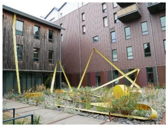 Traverses by Aurélien Bory 2016 is a work that was created during the redevelopment of Boulevard Léon-Bureau. It is a 15-metre wide, busy street on the Île de Nantes, connecting the Parc des Chantiers and the quartier de la Création. The work aim to slow down car traffic and create a public space connecting all users, car drivers, cyclists, and pedestrians, in a safe, collision-free way, without introducing traffic lights. The introduction of the art installation was intended to give the place an individual character and meaning, alluding to the creative factor on the island while at the same time not disrupting its functionality but supporting it. A proposal by Aurélien Bory, set designer, choreographer, and director, was selected for realisation, proposing to highlight pedestrian crossings through intersecting wavy lines (Figure 9). The peculiar dance of public transport is graphically reflected on the surface of the street. It invites users to interact and is reminiscent of childish games played ‘in passing’ while wandering around the city (Traverses 2016).