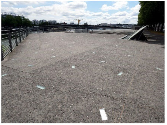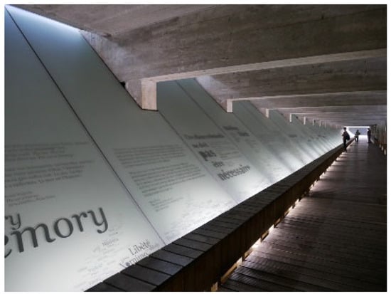 The tragic fate of the slaves, transported by Nantes ships, is commemorated. In 2012, the Mémorial de l’abolition de l’esclavage (Memorial to the Abolition of Slavery) by Krzysztof Wodiczko and Julian Bonder was unveiled (Figure 15). It is located on the banks of the Loire, on the Quai de la Fosse, which is a significant location. It was here that there was a port from which slave ships departed. The monument is also incorporated into a symbolic–architectural–urban premise. It is situated opposite the Palace of Justice (arch. Jean Nouvel, 2000) and a footbridge, connecting the city to the island, named after Victor Schœlcher, who led the outlawing of slavery in France in 1848. The monument is based on two gestures, unveiling and immersion, and consists of an underground and an above-ground section. The underground section is a 140-metre-long walkway made of concrete and glass that lets in narrow lines of light reflected from the water. It is a very discreet but evocative recreation of the ship’s hold. The experience is enriched with words and sound, and one can read and listen to texts related to slavery. At the end of the walkway there is a telescope with a view of the Palace of Justice. The 350-metre-long above-ground section mainly features the names of slave ships embedded in the granular pavement, engraved on glass panels (Figure 16). They are extremely numerous: as many as 2000, which makes the visitors aware of the scale of the practice (Ostolski and Wodiczko 2013).
