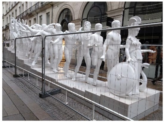 However, sometimes the scale of social problems far exceeds the capacity of any city. A symbol of this helplessness may become a certain image from Nantes in 2023 (Figure 17). European Thousand-Arms Classical Sculpture is the work of Xu Zhen, which appeared in the city on the occasion of the next edition of the festival Le Voyage à Nantes. The artist made copies of nineteen statues iconic to Western culture—such as the Athena Parthenos and New York’s Statue of Liberty. He unified the scale and lined up the statues in a row, making the illusion of a single figure with multiple waving arms like that of an Indian deity from the front. The work challenges the traditional idea of cultural separation (Le Voyage à Nantes 2025). However, soon after installation, the sculpture was locked in a cage for safety. It was why the riots erupted across France after a 17-year-old boy was shot dead by police in a Paris suburb. The city overwrote its own iconography.