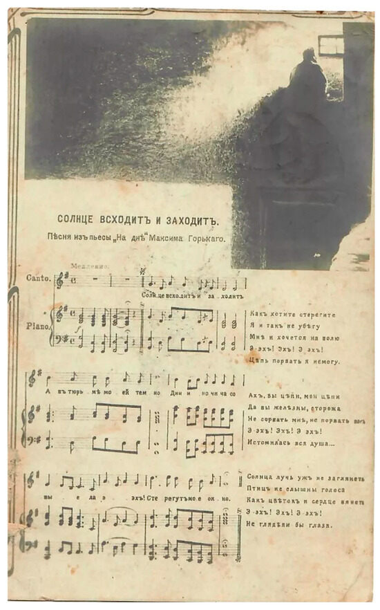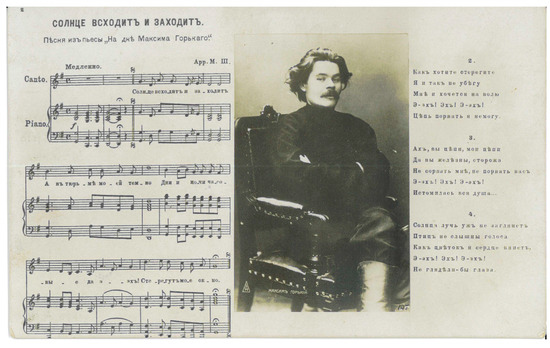 “The Sun Rises and Sets. Song from the play ‘The Lower Depths’ by Maksim Gorky,” posted in January 1911. Publisher and publication date unknown.