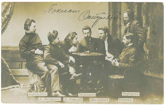 “Skitalets, L. Andreyev, M. Gorky, Teleshev, Shaliapin, Bunin, Chirikov,” 1902. Publisher unknown; publication date pre-1904.