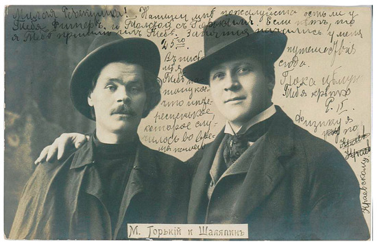 “M. Gorky and Shaliapin,” 1901, posted in August 1902. Published by “Richard,” St. Petersburg; publication date pre-1904.