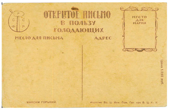 “Postcard for famine relief. Maksim Gorky.” Published by the Tsentral’naia Komissiia pomoshchi golodaiushchim pri VTsIK, 1921.
