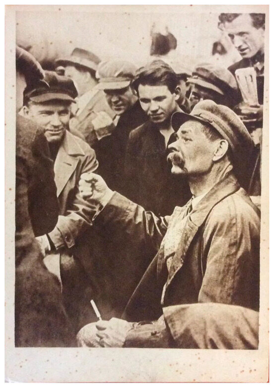 With Gorky’s return to the Soviet Union came the return of the photo-documentation of his life. Images of Gorky from 1928 to 1936 are abundant, yet few postcards of Gorky actually published during that period can be found on the current market; a search of online collections is similarly unproductive. A card depicting Gorky among workers at the Baltic Shipbuilding factory appears to be one of those rarities, and it comes from a series from the early 1930s called “Industrial Leningrad,” with photographs by N.N. Shtertser. (Figure 21) Though there are many postcards on the market featuring photographs from Gorky’s final years, the manufacture date of those cards is in fact much later.