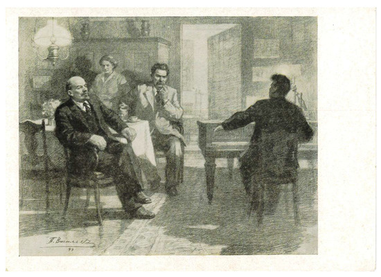 P. V. Vasiliev, “V. I. Lenin and A. M. Gorky listen to a pianist,” 1949. Published by Ministerstva sviazi SSSR, 1957.