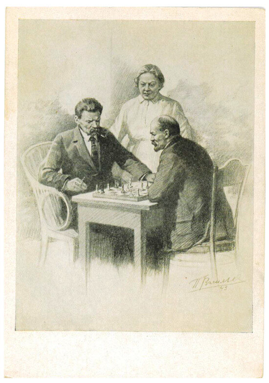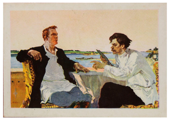 Similarly, the cards in Figure 25 and Figure 26, issued in 1957, feature works by the artist P.V. Vasiliev, and they reunite Gorky with his “friend” Lenin. In the first, entitled “V.I. Lenin and A.M. Gorky listen to a pianist,” we see them as men of fine tastes. The second card depicts them playing chess under the watchful eye of Nadezhda Krupskaya, Lenin’s wife.4 Such scenes must be based at least in part on fantasy, given Gorky’s bitterness toward the role Lenin played in orchestrating the October revolution and his own departure to Sorrento in 1921, in some accounts at the forceful urging of Lenin. These paintings—and their dissemination through postcards—illustrate the mythmaking around both men, especially in the post-Stalin period.