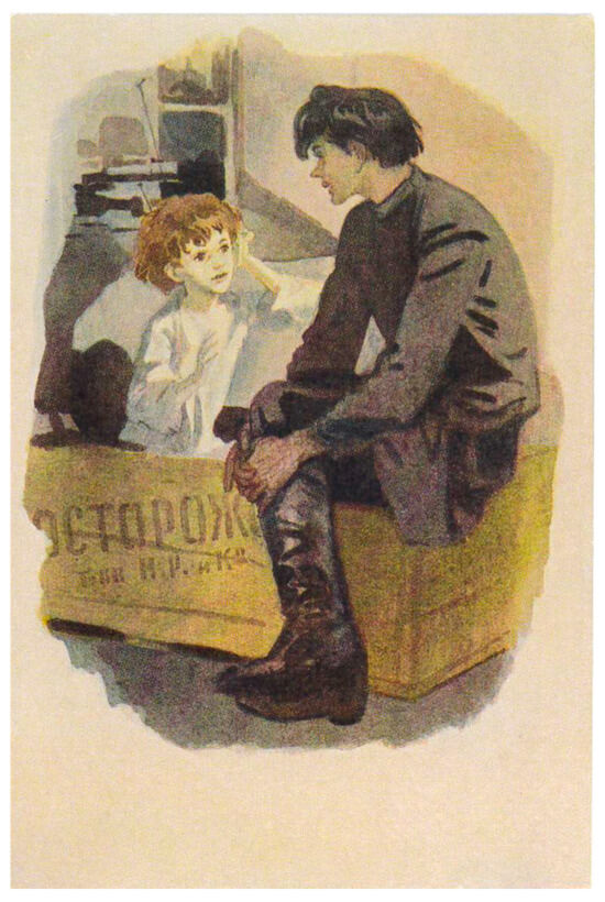 The publishing house Sovetskii Khudozhnik also issued cards depicting scenes from Gorky’s works, like the one from 1953 in Figure 27, which depicts the disabled boy Lenka from Gorky’s 1913 story “Strasti-Mordosti,” commonly translated as “Hobgoblins.” The child of a prostitute, living in terrible poverty, with withered legs, Lenka gains deep sympathy from the story’s first-person narrator, who, not surprisingly, in this rendering looks an awful lot like the young Gorky. Here again we see a deliberate blending of the writer’s literary output and his own biography.