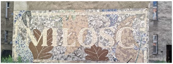 The accuracy of the concept and popularity of the idea are reflected in the two-part mosaic map created in cooperation with residents. It contains suggestions for walking paths along the mosaic trail, during which one can see not only new but also historical artworks. This is related to Szczecin’s numerous translations of mosaics in the post-war period (1945–1989), commissioned by private and public institutions. After 1990, mosaics appeared through initiatives by cooperatives, residents, artists, city authorities, and entrepreneurs. The latest mosaics feature maritime themes or natural, local spots and landscapes, as well as common topics (Figure 1 and Figure 2).