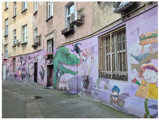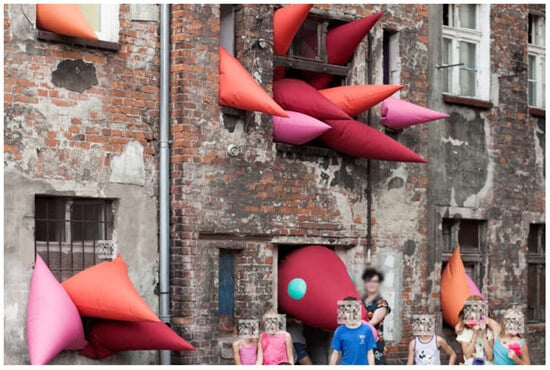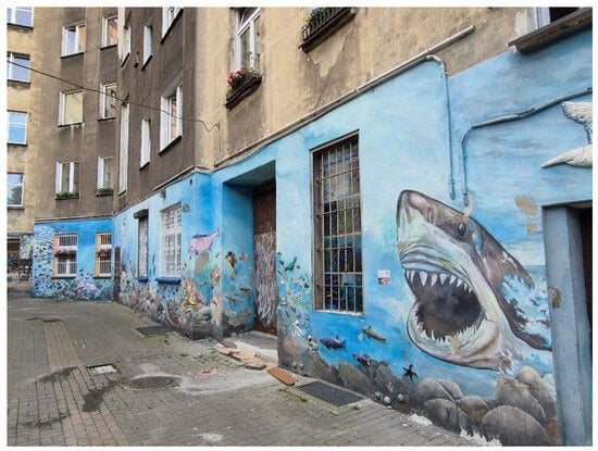 Artistic actions revitalize forsaken and neglected areas, transforming them into spaces for encounters, interactions, and dialog. They are also associated with aestheticization. The use of artistic activities for urban regeneration varies according to the political and economic conditions. In the United States and Western Europe, concepts such as creative placemaking (Markusen and Gadwa Nicodemus 2010) and cultural districts (Murzyn-Kupisz 2012) have become prevalent. Creative placemaking involves the use of culture and art in the deliberate transformation of the environment in collaboration with the local community. In this case, the potential and resources of space users are focused on creating spatial development concepts or actively participating in changing them to suit their needs. The given approach involves various actors in the co-design process, including the public and private sectors, nonprofit organizations, and direct users. A cultural district, on the other hand, refers to a clearly defined area of a city where a diverse range of cultural and artistic activities are implemented through grassroots or top-down initiatives, both private and public (Roodhouse 2010, p. 24). In Europe, examples of such neighborhoods are often located in post-industrial areas or at a distance from the city center. These types of districts are typically characterized by poor infrastructure and esthetics, as well as safety problems. However, they are also characterized by excellent spatial, architectural, and historical potential. Therefore, as a result of multidimensional remedial measures, a new layer of meaning and culture is “imposed” on the historic urban fabric, leading to the regeneration and new image of the area.