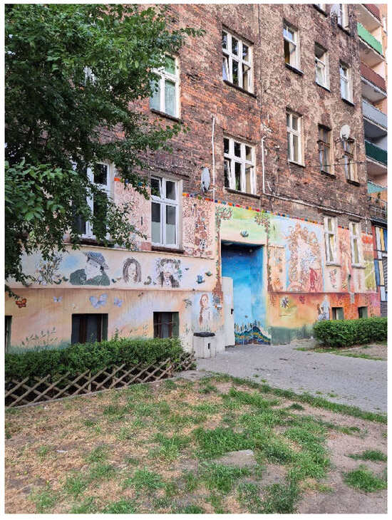 Therefore, the goal of the revitalization program focused not only on the beautification of the area but also on instilling a sense of responsibility in residents. It also encouraged them to take action in a common space. The concept was to transform Nadodrze into an arts and crafts center that would be friendly to various businesses (Wroclaw 2016). To this end, the OK! Art Foundation initiated the implementation of long-term creative projects involving local communities in Wroclaw’s urban space. Among the most notable projects one may find “Colorful Backyards,” which transformed intricate urban interiors between neglected old tenements into artistic, colorful spaces (Figure 3, Figure 4 and Figure 5). Consequently, two murals were brought to life in Wrocław’s Nadodrze district: “Backyard–Our Atelier” (2014–2015) and the “Backyard–Discovering Art” (2016–2017). The project began by establishing connections with local communities. First, artists from the OK! Art Foundation and animators from the Backyard Cultural Animation Center began creating free portraits for residents. During the process, conversations ensued, and with them, trust. Then came the time for art workshops, through which the target designs of the murals and murals themselves were created. The initiators aimed for the final result to be a visual representation of the residents rather than a creative expression by artists (Wroclaw 2016, pp. 84–85). Therefore, at each stage, they paid special attention to the quality and building of relationships with users. Meetings with artists enabled residents to express their ideas and needs while learning new skills.
