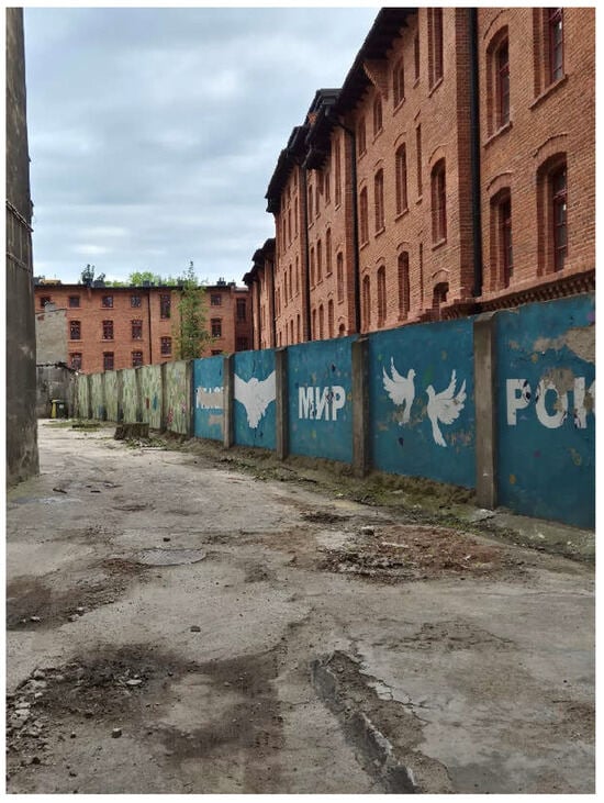 An example of grassroots activities (created on the initiative of an informal group) in Łódź is the 2021 Excluded Have a Voice Project, funded by the city’s microgrant program. The project targeted the wards of the probation center located in the vicinity of a renovated factory, which is currently a shopping and entertainment center. In this case, public space served as a medium through which previously excluded people could make their presence known. The project consisted of anti-exclusion workshops and collaboration during the creation of the mural: preparation of a concrete fence canvas, followed by creative work on stencils (in cooperation with the Academy of Fine Arts) (Grzyś 2024, pp. 219–21). The wall chosen as the backdrop for this project deteriorated and formed a clear spatial division within the courtyard. Therefore, the aim was not only to beautify the space but also to visually eliminate this impression. The murals improved the visual appearance of the courtyards. However, their social dimensions turned out to be much more significant. The work was carried out by children and young people from a curatorial center with the help of artists. Thus, the mural helped break down social and cultural barriers. The target group was able to make their presence visible in public spaces (Grzyś 2024, pp. 219–21). The two murals are simple but colorful. One depicts plant motifs, while the other refers to the idea of peace in defiance of the war in Ukraine (Figure 8).