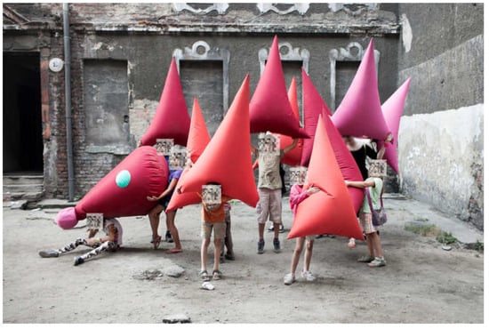Rutkowska’s work is part of a grassroots community art movement. Through her activities, the artist regularly contributes to spatial and social changes. One of her projects, titled “Jeż” (Hedgehog), created in 2015 as part of the “Wrocław–wejście od podwórka” (Wrocław–entrance from the backyard) initiative, was part of the visual arts program of the European Capital of Culture (Rut 2017). It was created in the backyard of a Wrocław housing estate in Przedmieście Oławskie, a neglected and notorious neighborhood. The primary goal focused on the creation of artwork that would address the needs of the local community and be dedicated to it. First, the artist selected a location and spoke to the residents. This allowed her to better understand the expectations, needs, and problems they faced. From these conversations, the concept of a large-format hedgehog mascot emerged. It was intended to serve as a pretext for further encounters among adults and as entertainment for local children. The artist also wanted to “domesticate” this space. This was particularly important given the neglected nature and visually unattractive condition of the area itself. Therefore, residents were reluctant to spend time there, which hindered their integration.