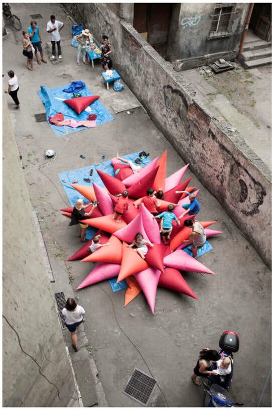 The Hedgehog was made of more than a dozen colorful small pieces constructed and installed by the artist and residents (Figure 9 and Figure 10). The 8 m-long, colorful mascot encouraged children to go out into the yard and play. You could jump on the Hedgehog, cuddle up to it, and lie down on it (Figure 11). As complementary activities, animated films about hedgehogs were screened, and drawings and tattoos with a hedgehog motif were created. Due to the popularity of this project, the artist and the children gathered around the Hedgehog managed to raise funds on a public collection basis to continue the project and go on vacation. In addition, the Hedgehog encouraged adults to come out to the courtyard, where they had the opportunity to get to know each other, integrate, and think about the quality of the area and the possibilities for its improvement.