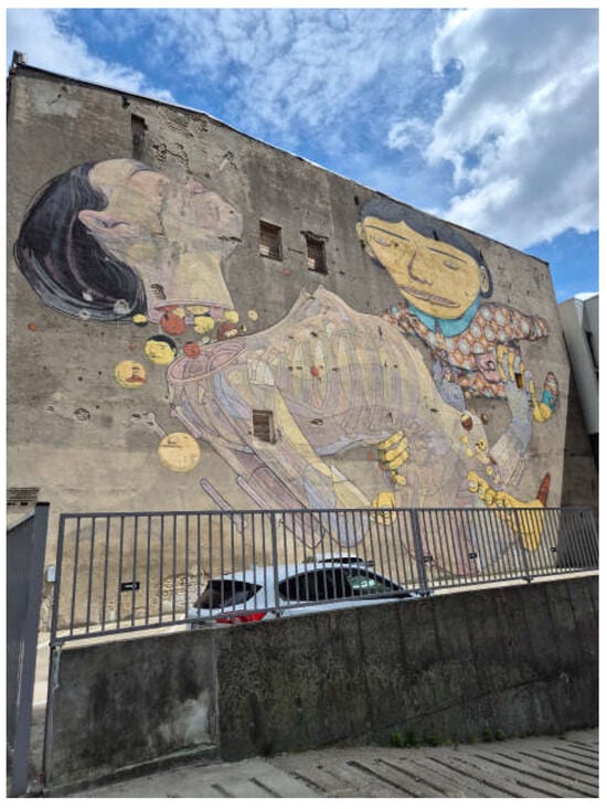The Urban Forms Foundation is one of the most critical organizations shaping public spaces in Łódź through art. Since 2008, the Foundation has completed more than 149 murals and art installations in Polish cities. During the Urban Form Festival, which was organized periodically (the last edition was held in 2018), workshops, picnics, meetings with artists, and educational activities were held, in addition to the creation of new street artworks on selected walls. Projects implemented by the Foundation were developed in close cooperation with residents and local activists. Activities included the Open Gallery of Young Art, which allowed young artists to showcase their work in public spaces such as underpasses while attempting to transform the esthetics of neglected spaces (Figure 13 and Figure 14). However, the participation of the local community was crucial, as they were involved in selecting the walls and sharing their opinions, which had a tangible impact on the final shape of the artwork.