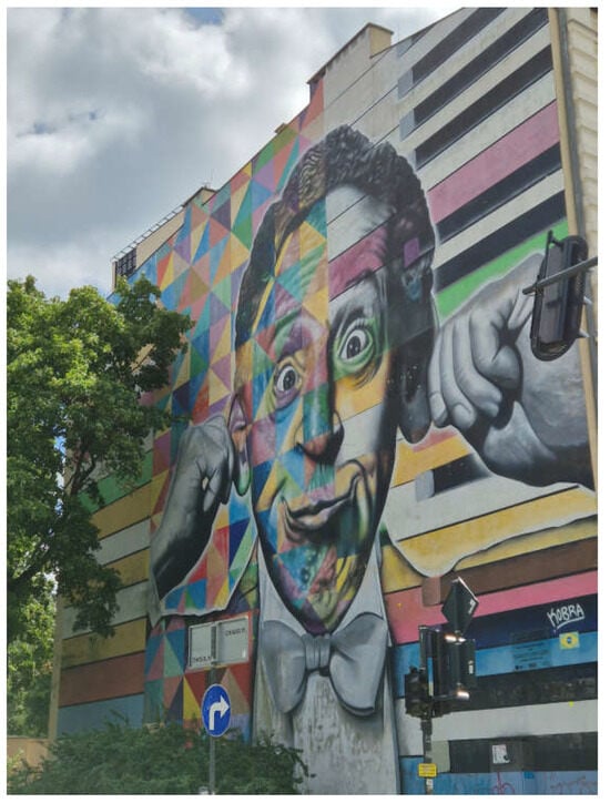 Different studies and reports (Urban Forms 2014) demonstrate that such activities strengthen neighborhood ties, build a sense of pride, and activate the local community. Residents usually approve this type of art concept (Statucki 2019, p. 120). For the most part, they reacted positively to the murals, recognizing that they contributed to the city’s beautification. This aspect is not insignificant, given that it was noted in the 2014 State of the City Report (Łódź City Council 2020, p. 23). Hence, there was no shortage of statements in the survey report that murals serve to beautify the streets, brighten up Łódź, enliven the space, and refresh gloomy areas. Moreover, due to the murals, especially their vibrant colors, Lodz has become much more visually attractive and colorful despite the prevailing “grayness and ugliness” of the neglected streets and tenements around (Łódź City Council 2020, p. 23). This is also reflected in the tourism industry. Until recently, areas that did not arouse much interest have become tourist destinations due to art in Łódź public spaces (Mokras-Grabowska 2015, p. 26).