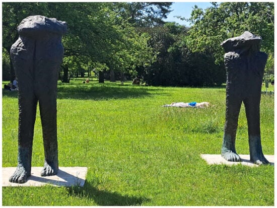 The idea of creating the Bródno Sculpture Park originated from the efforts of several entities. These included local officials from Warsaw’s Targówek district, Polish artist Althamer, and the Museum of Modern Art in Warsaw. Targówek is a peripheral district in Warsaw. It was considered the poorest part of Warsaw during the post-war period. In the 1970s, large housing blocks were built in a given area, which significantly altered their appearance, as well as the 22.5-hectare park. In 2009, Poland’s only Sculpture Park was initiated on its grounds as part of a grassroots initiative (Figure 15 and Figure 16). It was intended to be a community park. Therefore, it should engage local users and nurture connections. Moreover, the originators wanted art to be accessible to everyone.