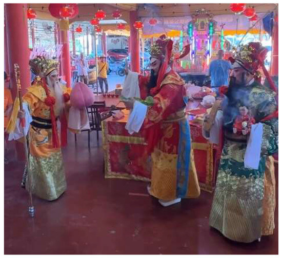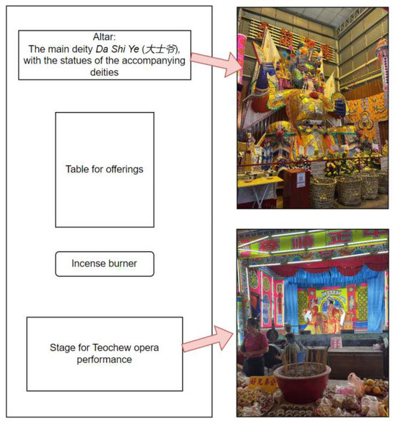 In contemporary Malaysia, Teochew opera remains a vital component of rituals, particularly within the religious practices of the Malaysian Chinese community that centre on beliefs in deities, ancestral spirits, and wandering ghosts. In Penang, where the tradition is especially well preserved, the opera continues to be performed during a wide range of ceremonial events, reflecting its enduring ritual significance. Table 1 shows the occasions on which the researcher observed it being performed during fieldwork. These performances are typically held in fixed temples, erecting a temporary stage opposite the statue of deities and dismantling after the event, as shown in Figure 1. The continued observance of these ritual forms in Penang highlights the relative integrity of Teochew opera’s ceremonial role within the local cultural–religious landscape.
