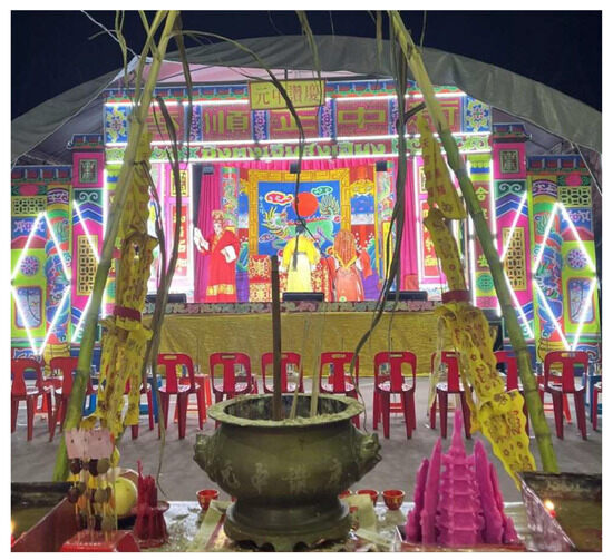 Teochew opera performed during the rituals preserves traditional customs. For example, during the Hungry Ghost Festival, a seating area is arranged for ghosts to watch a performance, as illustrated in Figure 2. According to Chinese traditions, attracting these ghosts through theatrical performances and placing offerings on the seats is believed to mitigate the harm they might inflict on the communities (Lim 2021).