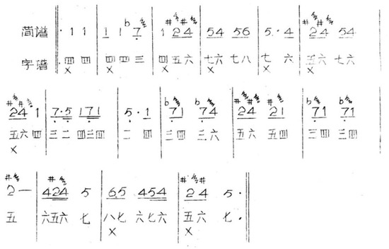 An excerpt from the traditional two-four score of Teochew opera, which identifies pitch by Chinese numerals in Chinese characters. This traditional notation uses the Chinese numerals 二三四五六 (two, three, four, five, and six) to denote pitch (Provided by Teh, 22 May 2024).