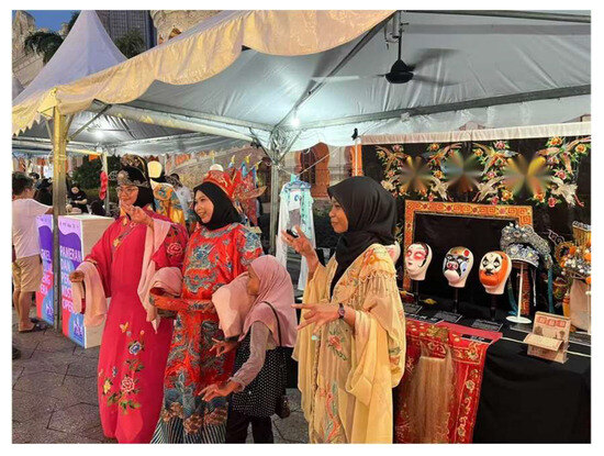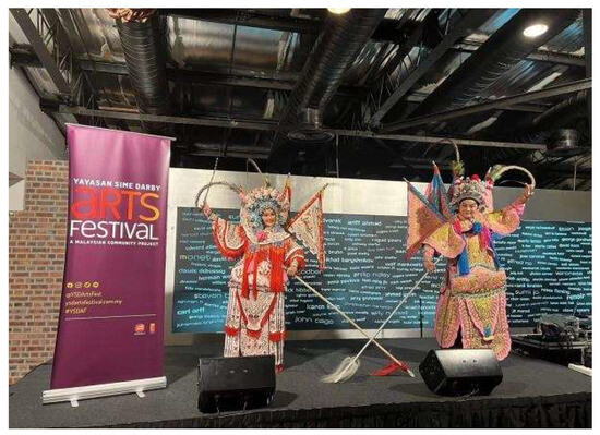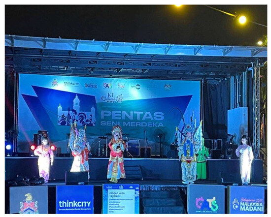 The National Development Policy 1991 and Wawasan 2020 laid the groundwork by promoting economic expansion and encouraging cultural inclusivity. While primarily focused on economic growth, these policies indirectly enabled the flourishing of the arts by increasing government support for cultural infrastructure and festivals (Mauzy and Milne 2002). Opera troupes began participating in city-run events, community celebrations, and state-organised exhibitions, reaching broader and more diverse audiences. Corporate sponsorships and local government funding further expanded performance opportunities beyond temple grounds. The introduction of the National Heritage Act 2005 formalised the state’s commitment to cultural protection by providing legal mechanisms for the safeguarding of both tangible and intangible heritage (Mustafa and Abdullah 2013). Although Teochew opera has not yet been officially recognised under the act, the inscription of other Chinese cultural forms, such as the lion dance and the twenty-four festive drums, has inspired opera practitioners and validated their preservation efforts. Since then, opera performances have become more visible at official cultural events and public festivals, often framed as representative of Chinese Malaysian heritage. More recently, the Malaysian National Cultural Policy (DAKEN 2021) has further encouraged the integration of minority cultural practices into national narratives. While reaffirming the centrality of national identity, this policy explicitly supports cultural diversity, sustainability, and heritage innovation (The Government of Malaysia’s Official Portal 2021). Under this policy, Teochew opera has received increased support through collaborations with heritage institutions, tourism programmes, and educational initiatives. Its inclusion in government-funded cultural programming has widened its presence in secular performance spaces such as urban theatres, cultural parks, and community halls, as shown in Figure 6 and Figure 7.