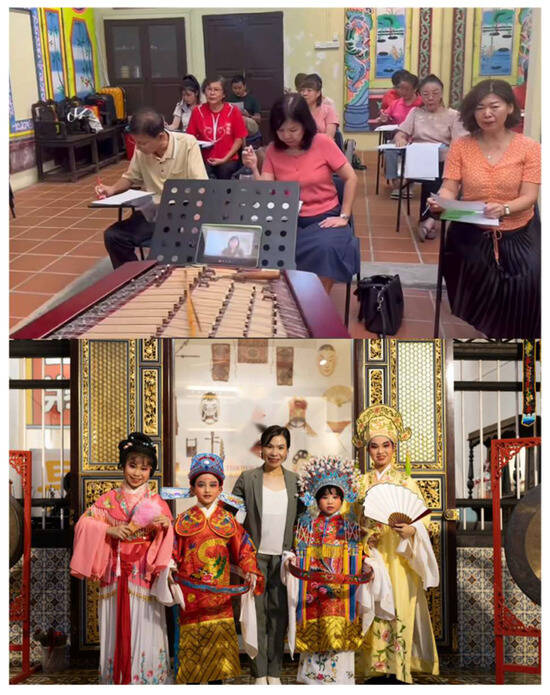 To address the pressing issue of generational transmission, Malaysian Teochew opera practitioners have increasingly turned to structured, institutional approaches to teaching. A significant development in this regard is the establishment of a heritage centre in Penang, initiated through collaboration with the Guangdong Teochew Opera Institute (as shown in Figure 10). The centre operates as a dedicated training facility offering systematic instruction in music, stylised performance techniques, and dialect pronunciation, while also serving as a resource hub for archiving teaching materials and experimenting with simplified musical notation. Crucially, the heritage centre promotes accessibility by welcoming learners across ethnic backgrounds, age groups, and language proficiencies (as shown in Figure 11). This inclusive approach not only broadens participation but also fosters intercultural understanding, positioning Teochew opera as a shared cultural resource within Malaysia’s plural society.